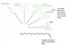 Five available fluorescent dyes that can be bound to the reactive linker. In addition, the terminal chlorine of the reactive chloroalkane can be visualized.