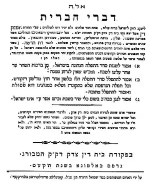 Liebermann added Chorin and Kunitz's letters to those of Samun and Recanati, from which he removed the dates and openings that indicated they were from 1816.[22] He published the four in a compendium titled "Radiance of Justice" ("Nogah ha-Tzedek"). He also authored a long concluding chapter, "Radiant Light" ("Or Nogah") where he denounced the rabbis of his day. Liebermann mixed enlightened notions with quotes from nonconformist Jewish medieval philosophers, especially Leon of Modena. He attacked decisors for demonstrating legalistic rigidity, arrogance and apathy as many of the young turned away from religion.[23] A minor point he made was justifying less mourning and prayers about the Jerusalem Temple, arguing these also constituted Hastening the End.[24] He did not spare common Jews either, blaming them for neglecting their children's religious education. Liebermann determined that some prayers should be recited in German, but only where people were ignorant of Hebrew.[25]