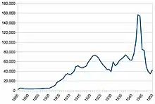 tickets and season tickets sold at Hamilton 1885–1950 (derived from figures in table).