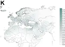 In Europe, K appears to be most common in the Morbihan (17.5%) and Périgord-Limousin (15.3%) regions of France, and in Norway and Bulgaria (13.3%).[5] The level is 12.5% in Belgium, 11% in Georgia and 10% in Austria and Great Britain.[6] Some specific subclades of K among Europeans are K1a1b2b in Finland,[7] K1a3a1 in Sardinia,[8] K1a19 in Hungary,[9] K1b1b1a in Greeks,[10] K1b1c in Serbia,[11] Slovakia,[12] and Poland,[13] K1c2 in Irish[14] and Germans[15] and in Hungary,[16] and K2a9a in Sardinia.[17] A 2013 study had suggested that K1a1b1a, K1a9, and K2a2a1 could have originated from Western Europe.[18]