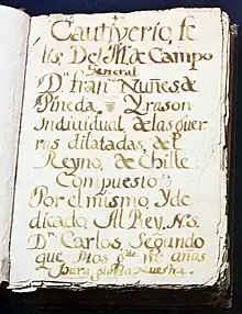 Happy Captivity and Reason for the Prolonged Wars of the Kingdom of Chile (Cautiverio feliz y razón individual de las guerras dilatadas del reino de Chile), better known as simply Happy Captivity (Cautiverio Feliz) is a literary log written in 1673 by Chilean Spaniard Francisco Núñez de Pineda y Bascuñán, which narrates his experiences as a captive war soldier in 1629 at the hands of Mapuche warriors during the War of Arauco. This novel, which shows the contrasts between the two cultures, constitutes an important testimony in the intercultural relations and Indigenous customs of the 17th century. Originally dedicated to King Charles II of Spain, it was republished in Santiago de Chile in 1863.