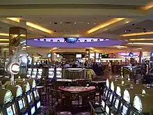 The Hard Rock opened with a 28,000 sq ft (2,600 m2) casino,[15] which included 800 slot machines.[218] By June 2005, the Hard Rock's Peacock Lounge had become one of the first venues in Las Vegas to use "smart" casino chips embedded with radio-frequency identification hardware.[219] As of September 2008, a $30 million poker room had been opened in the casino,[220] replacing a cigar shop.[118] The poker room measured 7,000 sq ft (650 m2) and included 18 tables.[220] Following the resort's 2007-2010 expansion, the casino measured 61,704 square feet (5,732.5 m2).[221] Up to that time, the casino portion of the resort had not been a significant source of revenue.[222][223]