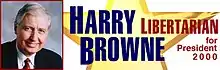 The 2000 presidential campaign of Harry Browne, investment banker and 1996 nominee of the Libertarian Party, was formally launched on February 14, 2000 as Browne announced his intention to seek the Libertarian Party nomination for the presidency of the United States in the 2000 presidential election. Browne gained the Libertarian nomination on the first convention ballot becoming the first person to win the party's nomination twice and Art Olivier, former mayor of Bellflower, California, was nominated as his vice president.[2]
