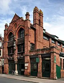The style of his new brick-built workshop has been described variously as "'domesticated' or modified Queen Anne Flemish",[7] a "freely-treated Jacobean character",[6] and "gothic styled but with several peculiar additions".[3] Nikolaus Pevsner called it "fanciful".[8] It opened in 1883 and was extended the following year.[2] Hems named it "Ye Luckie Horseshoe Studio". It extends over three floors and has a circular window in the gable facing the road that incorporates Hems's monogram.[3] At the company's peak, after 1895, Hems employed over a hundred craftsmen,[9][10] and also had staff in London, Oxford and Ireland.[8] He lived next door to his workshop in a house, "Fair Park", with a prominent corner turret.[3]