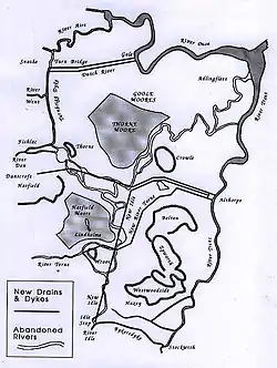 The eastern branch of the Don river was blocked and the banks of the northern branch into the River Aire were raised.[10] The northern branch was originally a Roman navigation channel called Turnbridgedike. A 2-mile (3.2 km) bank which ran along the south side of the river from Fishlake to Thorne included a navigable sluice, to allow boats to reach Sandtoft. Lifting gates gave access to a lock chamber which was 50 by 15 feet (15.2 by 4.6 m). Beyond Thorne, a further bank ran for 5 miles (8 km) to the Aire. The River Idle was blocked by a dam and its waters were diverted into the River Trent at Stockwith along Bycarrs Dyke. A 5-mile (8 km) barrier bank was constructed along the northern edge of the channel, from the dam to the River Trent. The Torne was embanked and straightened by cutting a drain which emptied via a sluice into the Trent at Althorpe. An 8-mile (13 km) drain was cut from where the Idle had been blocked to Dirtness, passing under the Torne at Tunnel Pits. At Dirtness it was joined by another drain, bringing water from the west, and then ran for a further 5 miles (8 km) to another sluice at Althorpe. The work was on a scale not previously seen in England, and Vermuyden's contribution was recognised when he was knighted in January 1629.[11] In 1629, a Court of Sewers for the Level of Hatfield Chase was established by royal warrant.[9]