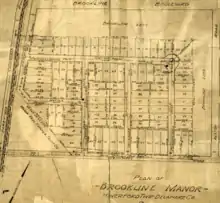 Some construction began around that year, but it was not until after the First World War that the Manor Real Estate Company, a subsidiary of the railroads, set out a plan for a housing development that offered every service, amenity and community need: "Brookline Manor" (see map). As in the 1909 plan, there is an arrangement of regular streets divided by a broad boulevard. The boulevard intersected at a "T" juncture with the major township thoroughfare, Darby Road. The Boulevard would be home to commercial, religious and educational services. At the upper end of the Boulevard, mercantile stores provided shoe makers, tap rooms, florists, bakery, barbers, a five and ten store, the Quaker Store, the A&P grocery store and the Boulevard movie theater.[11] Along the length of the Boulevard the community found their religious houses of worship: the Methodist Church, Saint Faith Episcopal Church, Church of the Annunciation of the Blessed Virgin Mary, and Temple Lutheran. On Earlington Road, to the side of the Boulevard's far end, the Brookline School (1913) met educational needs.[12]