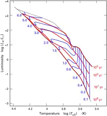 The end (leftmost point) of every track is labeled with the star's mass in solar masses (M☉), and represents its position on the main sequence. The red curves labeled in years are isochrones at the given ages. In other words, stars 105 years old lie along the curve labeled 105, and similarly for the other 3 isochrones.