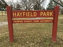 In 1967, Hayfield Elementary School opened[3] then in 1969, the Hayfield Secondary School opened.[4] Both of the schools are part of the Fairfax County Public Schools system. Both Schools share the mascot of a Hawk.