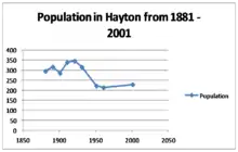 In the 2001 UK Census the village consisted of 89 households with a total population of 229 .[7] The largest population was recorded in the 1921 Census when there were 346 residents within the Hayton and Mealo area. From 1921 to 1961 population gradually decreased to 214 which is likely to be due to the change in agricultural processes and the increased use of machinery which reduced the size of labourforce needed.[8]