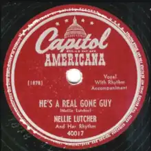 "He's a Real Gone Guy" is a song written and sung by Nellie Lutcher with backing on the record by a group called "Her Rhythm". Lutcher also played the piano on the record which was released in July 1947 on the Capitol Americana label (catalog no. 40017). It debuted on the Billboard magazine's race records chart on September 27, 1947, peaked at No. 2, and remained on the chart for 23 weeks.[2] It was ranked No. 9 on the magazine's year-end list of the most played race records of 1947.[3]
