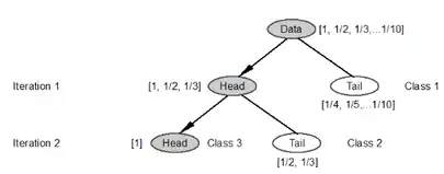 Given some variable X that demonstrates a heavy-tailed distribution, there are far more small x than large ones. Take the average of all xi, and obtain the first mean m1. Then calculate the second mean for those xi greater than m1, and obtain m2. In the same recursive way, we can get m3 depending on whether the ending condition of no longer far more small x than large ones is met. For simplicity, we assume there are three means, m1, m2, and m3. This classification leads to four classes: [minimum, m1], (m1, m2], (m2, m3], (m3, maximum]. In general, it can be represented as a recursive function as follows: