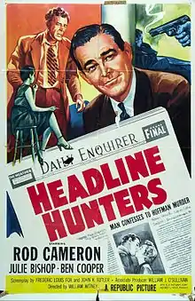 Headline Hunters is a 1955 American crime film directed by William Witney and written by Frederick Louis Fox and John K. Butler. The film stars Rod Cameron, Julie Bishop, Ben Cooper, Raymond Greenleaf, Chubby Johnson and John Warburton. The film was released on September 15, 1955 by Republic Pictures.[1][2][3]
