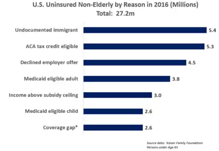Number U.S. uninsured by reason in 2016 (non-elderly/under 65 years of age). An estimated 43% of the uninsured were eligible for financial assistance.[34]