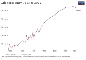 Demographic transition have been notorious in the last 7 decades in Mexico. Life expectancy at birth (general) changed from being 45 years in 1950 to 71.5 years in 1990, and to actually reach 77.5 years, close to some high-income countries in America and the World.[48][51] Child mortality rate, as one of the major health trends, have improved most notoriously after 1950, when an average of 252 children under-five years were dead per 1000 live births, decreasing to 44.5 in 1990 and reaching 14.6, in 2018.[48][51] Finally, after 1970, at least 20 years after the major changes in life expectancy and child mortality rate, there was a decrease in fertility rate. In 1950 it was estimated that for every woman, around 6.67 babies were born; in 1970, it increased to 6.8 and then, steadily decreased to 3.4 in 1990 to finally end in 2.1, which is below the world average.[48][51]