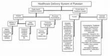The healthcare delivery system of Pakistan (تحفّظ صحتِ عامّہ ، پاکستان) is complex because it includes healthcare subsystems by federal governments and provincial governments competing with formal and informal private sector healthcare systems.[3][2] Healthcare is delivered mainly through vertically managed disease-specific mechanisms. The different institutions that are responsible for this include: provincial and district health departments, parastatal organizations, social security institutions, non-governmental organizations (NGOs) and private sector.[4] The country's health sector is also marked by urban-rural disparities in healthcare delivery and an imbalance in the health workforce, with insufficient health managers, nurses, paramedics and skilled birth attendants in the peripheral areas.[5][6] Pakistan's gross national income per capita in 2021 was $4,990 and the total expenditure on health per capita in 2021 was Rs 657.2 Billion, constituting 1.4% of the country's GDP.[7] The health care delivery system in Pakistan consists of public and private sectors. Under the constitution, health is primarily responsibility of the provincial government, except in the federally administered areas. Health care delivery has traditionally been jointly administered by the federal and provincial governments with districts mainly responsible for implementation. Service delivery is being organized through preventive, promotive, curative and rehabilitative services. The curative and rehabilitative services are being provided mainly at the secondary and tertiary care facilities. Preventive and promotive services, on the other hand, are mainly provided through various national programs; and community health workers’ interfacing with the communities through primary healthcare facilities and outreach activities. The state provides healthcare through a three-tiered healthcare delivery system and a range of public health interventions. Some government/ semi government organizations like the armed forces, Sui Gas, WAPDA, Railways, Fauji Foundation, Employees Social Security Institution and NUST provide health service to their employees and their dependants through their own system, however, these collectively cover about 10% of the population. The private health sector constitutes a diverse group of doctors, nurses, pharmacists, traditional healers, drug vendors, as well as laboratory technicians, shopkeepers and unqualified practitioners.