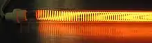 Radiative heating elements (heat lamps) are high-powered incandescent lamps that run at less than maximum power to radiate mostly infrared instead of visible light. These are usually found in radiant space heaters and food warmers, taking either a long, tubular form or an R40 reflector-lamp form. The reflector lamp style is often tinted red to minimize the visible light produced; the tubular form comes in different formats: