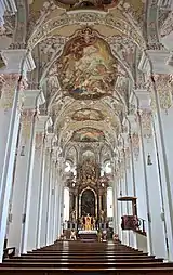 In the late 1960s, architect Erwin Schleich replaced the church's simple white interiors from the 1950s renovation with recreations of its original frescoes and Rococo ornementation.[2]