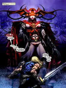 She is seen attending a meeting with Mephisto, Blackheart, Satannish and Dormammu about a disturbance created by the newly resurrected Magik, who is looking for the soulsword and the original Bloodstone amulet. Belasco's daughter, Witchfire appears during the meeting and reveals she is now the current owner of the original amulet and vows to take her father's place as ruler of Limbo and seat at their table.[34]
