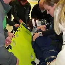 The National Collegiate Athletic Association in its advice to athletic trainers and team physicians, contained in the NCAA Sports Medicine Handbook, advises that the helmet should never be removed from an injured athlete, conscious or unconscious, with a suspected or potential head or neck injury during pre-hospital management. In this advice, certain assumptions are made. The first is that the facemask can be removed so that airway care, if needed, can be carried out. The second is that the helmet fits securely so that supporting the helmet will support the athlete's head and neck. The advice accepts that helmet removal may be necessary if an ill-fitting helmet prevents the head and neck from being secured safely for emergency transport. It is also accepted that helmet removal may be necessary if, for some reason or another, the facemask cannot be removed in a reasonable time. There is general agreement that should helmet removal be required, it should only be carried out by trained personnel. The NCAA also asserts that the injured athlete should be maneuvered to a spine board for transport as a 'single unit' using a lift/slide maneuver or log-roll technique. [3]