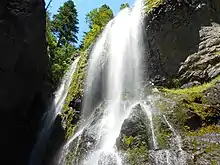 Henline Falls has a height of 126 feet (38 m) and a width of 50 feet (15 m).[1] Henline Creek supplies the flow of water to the falls.