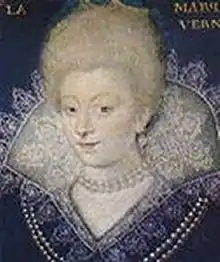 Some sources claim the duke of Guise was Margaret's first lover, but this is highly unlikely. For political reasons, the duty of a Daughter of France was to be a virgin at the wedding and for this she was very guarded. If Margaret had really compromised her reputation, Jeanne d'Albret would not accept the marriage between her son and the princess.[7] Although certainly after the wedding, Margaret was unfaithful to her husband, many of the extramarital adventures are the result of pamphlets that have had to politically discredit her and her family: the most famous was Le Divorce Satyrique (1607), who described her as a nymphomaniac.[8]