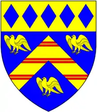 Arms of Lopes: Azure, a chevron or charged with three bars gemelles gules between three eagles rising of the second on a chief of the second five lozenges of the first[1]