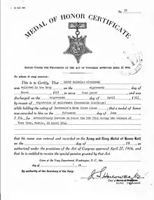 Rank and organization: Boatswain's Mate Second Class, U.S. Navy U.S.S. Utah. Place and date: Vera Cruz, Mexico, 21 April 1914. Entered service at: West Virginia. Birth: Edgewood, W. Va.