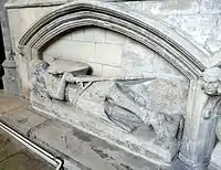 - ↑ Identification per Orme, Nicholas, "Whose Body?", published in "The Cathedral Cat, Stories from Exeter Cathedral", 2008, p.25, who identifies Raleigh as the left-most (westernmost) of two similar effigies. Pevsner, Buildings of England: Devon, 2004, p.381 identifies him as the right-most