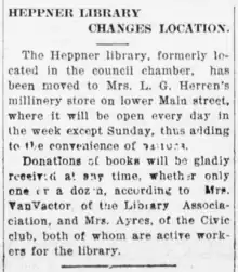 Newspaper article detailing the library's move to the millinery shop. Image provided by University of Oregon Libraries and the Morrow County Museum; Heppner, OR.