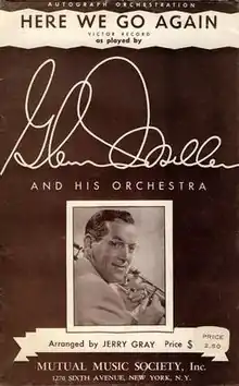 "Here We Go Again" was composed by Jerry Gray, the arranger in the Glenn Miller Orchestra. Glenn Miller and His Orchestra released the song as an RCA Victor 78 single, 20-1563-A, backed with "Long Time No See, Baby", words and music by Jack Lathrop and Sunny Skylar.[1] The recording reached no. 25 on the Billboard pop singles chart in April, 1944 in a one-week chart run.[2] The song was also performed by Glenn Miller with the Army Air Force Band.