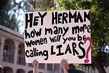 In October 2011, Politico reported that two female employees had complained about inappropriate behavior by Cain during his tenure at the National Restaurant Association. The women reportedly accepted financial settlements from the association which barred them from discussing their allegations further.[45] Cain's campaign initially refused comment,[46] but subsequently acknowledged that the accusations had been made.[47] Cain strongly denied any impropriety, stating: "I have never sexually harassed anyone and those accusations are totally false." He initially denied being aware of any financial settlement with the accusers, but later accepted that some form of payment had been made by the Restaurant Association.[48] He described the allegations as a "witch hunt".[49][50]