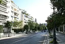 The tree-lined one-way street runs from north (Vasilissis Sofias Avenue) to south (Vasileos Konstantinou Avenue) connecting the districts of Kolonaki and Pangrati. It is, by far, the most expensive piece of housing real estate in Greece and one of the most expensive in Europe.[1] The five-block-long eastern side of the street is lined with luxurious apartments and mansions, foremost among them the Presidential Palace, the official workplace and residence of the president of the Hellenic Republic, and the Maximos Mansion (Μέγαρο Μαξίμου, Megaro Maximou), the official workplace of the prime minister. Kolonaki, a shopping district, lies immediately to the north, and Pangrati, a residential district, to the south, the National Gardens to the west and the Panathenaic Stadium to the southeast. The barracks of the Presidential Guard are the only buildings on the western (National Garden) side of the street. The street is heavily guarded by police (both uniformed and plainclothes) round the clock.