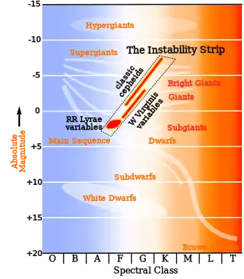 Most of the stars occupy the region in the diagram along the line called the main sequence. During the stage of their lives in which stars are found on the main sequence line, they are fusing hydrogen in their cores. The next concentration of stars is on the horizontal branch (helium fusion in the core and hydrogen burning in a shell surrounding the core). Another prominent feature is the Hertzsprung gap located in the region between A5 and G0 spectral type and between +1 and −3 absolute magnitudes (i.e., between the top of the main sequence and the giants in the horizontal branch). RR Lyrae variable stars can be found in the left of this gap on a section of the diagram called the instability strip. Cepheid variables also fall on the instability strip, at higher luminosities.