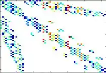 As an example, the figure on the left shows the sparsity pattern of the Hessian matrix where the columns have been appropriately coloured in such a way to allow columns of the same colour to be merged without incurring in a collision between elements.