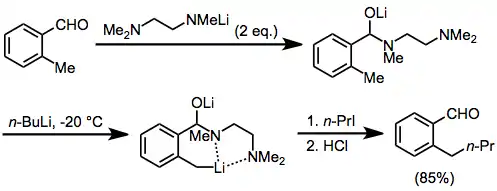 Aldehyde substituents suffer nucleophilic addition in the presence of organolithium compounds; however, adducts of aldehydes with lithium diamines can serve as effective directing groups for lateral lithiation. Subsequent treatment with an electrophilic primary alkyl halide and elimination of the diamine provides functionalized aryl aldehydes.[11]