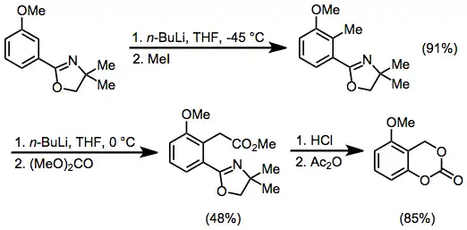 Ortho lithiation followed by methylation with methyl iodide is a convenient method for the synthesis of starting materials for lateral lithiations. Elaboration of the benzylic carbon through lateral lithiation and treatment with an electrophile provides a powerful synthetic alternative to direct electrophilic aromatic substitution (EAS). Although yields over the entire sequence are moderate, site selectivity is generally higher than analogous EAS reactions.[20]