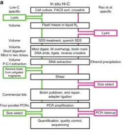 First described by Rao et al., in situ Hi-C combines standard Hi-C with nuclear ligation assay, i.e., proximity ligation performed in intact nuclei.[13][20] The protocol is similar to standard Hi-C in terms of the basic workflow outline but differs in other ways.[13] In situ Hi-C requires 2 to 5 million cells compared to the ideal 20 to 25 million required for standard Hi-C and it requires only 3 days to complete the protocol versus 7 days for standard Hi-C.[13] Furthermore, proximity ligation does not take place in solution like in standard Hi-C, decreasing the frequency of random, biologically irrelevant contacts and ligations, as indicated by the lower frequency of mitochondrial and nuclear DNA contacts in captured biotinylated DNA.[13] This is achieved by leaving the nuclei intact for the ligation step.[13] Cells are still lysed with a buffer containing Tris-HCl at pH 8.0, sodium chloride, and the detergent IGEPAL CA630 before ligation, but instead of homogenization of the cell lysate, cell nuclei are pelleted after initial lysis to degrade the cell membrane.[13] After proximity ligation is complete, cell nuclei are incubated for at least 1.5 hours at 68 degrees Celsius to permeabilize the nuclear membrane and release its nuclear contents.[13]