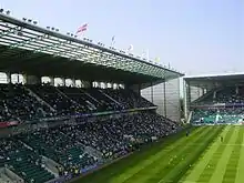 Hibernian next qualified for European competition in 2001, having finished third in the 2000–01 Scottish Premier League.[30] They entered the 2001–02 UEFA Cup and were drawn against Greek club AEK Athens.[30] The first leg in Greece, which was postponed by a week due to the September 11 attacks against the United States,[31] ended in a 2–0 defeat for Hibernian.[32] A strong performance in the return leg gave them a 2–0 lead, equalising the aggregate score.[32] Paco Luna missed a chance to score a third and tie-winning goal late in normal time, and the tie entered an extra period. Two away goals gave AEK an aggregate win, although Hibernian won 3–2 on the night.[32] Despite exiting the competition, the home game against AEK was fondly remembered by the Hibernian supporters; the actor Dougray Scott later named it as his favourite match.[33]