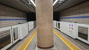 The station has two tracks and, unusually for this line, one physical platform, which is divided into Platform 1 for Nagoyakō Station, and Platform 2 for Kanayama Station. There is one wicket, beyond which are five exits. On Platform 1 to Nagoya Port, train door 13 is closest to the elevator, doors 13 and 9 are closest to the escalators, and door 16 is closest to the stairs. On Platform 2, door 5 is closest to the elevator and escalator and door 2 is closest to the stairs. There are public phones near the elevators on the platforms, near the wicket, and near Exit 4. There is a handicapped-accessible bathroom with a baby changing area, and a second baby changing area, outside wicket. The station has coin lockers. There is a minor bus rotary outside the station.[2] [3] [4]