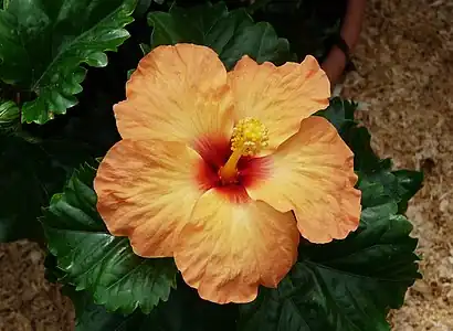 Hibiscus rosa-sinensis, known colloquially as Chinese hibiscus,[3] China rose,[3][lower-alpha 1] Hawaiian hibiscus,[3] rose mallow[4] and shoeblack plant,[5] is a species of tropical hibiscus, a flowering plant in the Hibisceae tribe of the family Malvaceae. It is widely cultivated as an ornamental plant in the tropics and subtropics, but its native range is Vanuatu.[6]