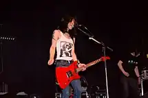 Hide was influenced by hard rock bands such as Iron Maiden, AC/DC and Bow Wow as well as punk rock acts such as The Clash and Sex Pistols.[3] However, Kiss guitarist Ace Frehley was his idol and biggest influence.[3][88][89] He preferred guitarists who make playing look "effortless" and who have "the skill, the looks and the attitude", naming Frehley, Jimmy Page and Joe Perry.[89] He cited Bauhaus' guitarist Daniel Ash as an influence as well.[3] Hide cited Iron Maiden's self-titled debut album for teaching him how to arrange twin guitar parts.[89]