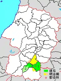 yellow & dark green area=original extent in early Meiji period; light green=area added in Showa period; green=present area; 1=Takahata; 2=Kawanishi