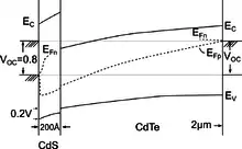 The application of a 200Å thick copper doped layer of CdS on top of a typically 2 μm thick CdTe solar cell, increases the open-circuit voltage substantially, so that it can reach the theoretical limit of the band gap of the CdTe-emitter when extrapolated to 0 K. This improvement can be explained by limiting the field in the CdS side of the junction when it reaches the critical value for a high-field domain to appear and thereby limits the maximum junction field to the domain field of typical 50 kV/cm.[13] This field is below a field in which electron leaking from the CdS into CdTe occurs, resulting in an increase of the open-circuit voltage and thereby an increase of the solar cell conversion efficiency.[14]