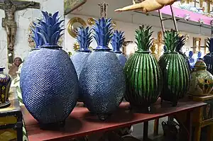 At first Alejos Madrigal made utilitarian items, but when he became interested in participating in competitions, he began to adapt his mother’s pineapple motifs. He became known for green glazed “pineapple” wares, designed to be pots, punch bowls, candelabras and other wares.[1][3] In addition to green, he also makes pieces in yellow and blue, all requiring skill and dexterity to create their detailed decorations.[1] The best known types of pineapple pieces are those called biznaga (barrel cactus) and conchita (small shell). The former is like a cross between a cactus and a pineapple and the latter is named from the tiny shell-shaped pieces of the pineapple “skin.”[2]