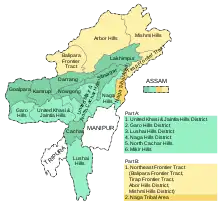 There were many violent struggles in the new hill states between non-tribal and tribal communities which disrupted the normal life for a prolonged period bringing hardship to all the citizens of the state.[29] Various attempts were made to resolve the often-violent struggles between the state and the hill tribes through accords, with varying degrees of success.[31] Almost all the ethnic groups are dispersed over different locations rather than living in one concentrated area, so a territorial area can only be achieved by redrawing boundaries and disenfranchising some of the residents.[32] Most peace accords guarantee cultural rights and include provisions for the rebels to disarm and receive assistance in returning to civilian life. Often the surrender and disarmament have been incomplete, while the guarantees of cultural rights have not been fully implemented due to the inter-tribal conflicts and having the potential to harm other groups. The accords generally establish a system of representation on a territorial or ethnic basis.[33] Often the accords have tended to decrease or destroy the authority of the signatory organization, which would then be replaced by more militant groups that were not part of the accord. This pattern has been seen in Nagaland, Manipur (Nagas), Assam (Bodo plains tribe) and Tripura.[34]