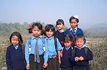 As of 2011 the state population was 1,978,000.[64] Nagaland is one of three states in India where the population is mostly Christian, the others being Meghalaya and Mizoram.[65] The people of Nagaland, collectively called Naga, are in fact a number of very different tribes with mutually incomprehensible languages.[66] Nagaland is home to 16 tribes: Angami Naga, Ao Naga, Chakhesang Naga, Chang Naga, Khiamniungan, Konyak, Lotha Naga, Phom, Pochury, Rengma Naga, Sangtam Naga, Sümi Naga, Yimkhiung, Zeme-Liangmai (Zeliang), Dimasa Kachari and Kuki.[67] There are also members of the Rongmei Naga. Each tribe has distinct customs, language and dress.[67]