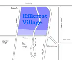 Hillcrest Village is a neighbourhood located in Toronto, Ontario, Canada. It is located in the northern district of North York. It is bordered by Finch to the South, Leslie Street to the West, Steeles to the North and Victoria Park to the East. Both neighbourhoods share the Don Valley as a point of reference in the Eastern border of the neighbourhoods.