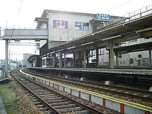 The station consists of one side platform and one island platform, connected by an elevated station building. The station is staffed.