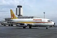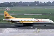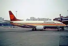 Hispania was founded in 1982 as an on-demand charter operator and began operations using two SE 210 Caravelle aircraft on charter flights to the Spanish resorts from Great Britain, Germany, France and other countries. In 1985 three Boeing 737-200 were added and those eventually replaced all the Caravelles.[1] As business increased, Hispania acquired a new fleet consisting of Boeing 737-300 and Boeing 757-200,[2] however, the aircraft lease payments were too expensive for the carrier to sustain and in 1988 it was nearly acquired by Air Europa. After the attempted takeover and other cash-investment schemes failed, Hispania ceased operations in July 1989.[3]