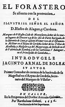 In 1535 it received the visit of Emperor Charles V, right in the town harbor, where he gathered an impressive fleet with the aim to win over Tunisia. Cultural life was vibrant, far from provincial, perfectly integrated in the cultural atmosphere of Habsburg Europe. Here were born or lived people of high caliber such as Sigismund Arquer, scholar, theologian, jurist and geographer, who died at the stake in Toledo, charged with being a Lutheran;[19] the lawyers John Dexart,[20] Francis Bellit,[21] Antonio Canales de Vega [22] and Francis Aleo;[23] the physician Joan Thomas Porcell;[24] the historian Giorgio Aleo;[25] the theologian Dimas Serpi;[26] Antonio Maria da Esterzili, author of the first play in Campidanese Sardinian;[27] the writer Roderigo Hunno Baeza, author of "Caralis panegyricus", a poem in Latin, composed around 1516, in which he exalted the city of Cagliari; Jacinto de Arnal Bolea, author of the first novel set in Cagliari, El forastero;[28] Juan Francisco Carmona;[29] the writer and historian Salvatore Vidal;[30] the poets Jose Delitala Y Castelvì and Joseph Zatrillas Vico;[31] the political officer of the Spanish Empire Vincenzo Bacallar Y Sanna; and the Marquis of San Felipe.[32] The latter was one of the founders of the Royal Spanish Academy and worked on the drafting of the first dictionary of the Castilian language.[33]